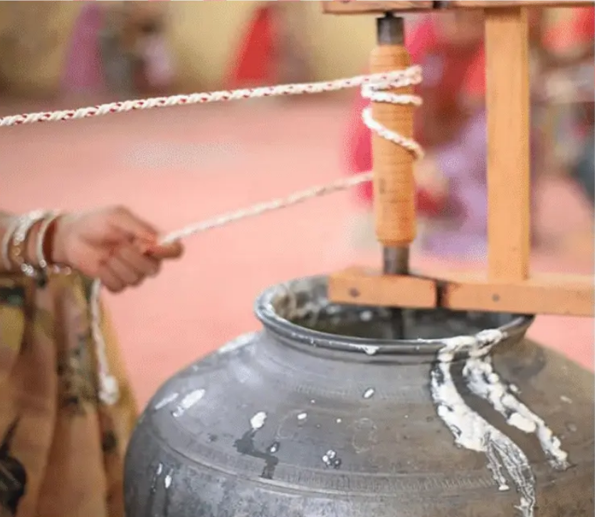 The curd is bi-directionally churned using the traditional Bilona method to separate butter.